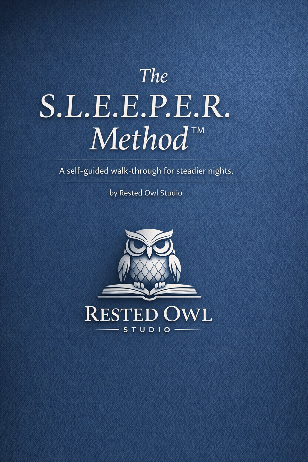 The S.L.E.E.P.E.R. Toolkit™ is a self‑guided walk‑through of Rested Owl’s proprietary method for steadier nights. This complete system includes the full S.L.E.E.P.E.R. Method™ guide, two companion resources, a Night Journal, and a Nightstand Cheat Sheet. Each product designed to work together to help you understand, apply, and sustain calm, restorative sleep.
